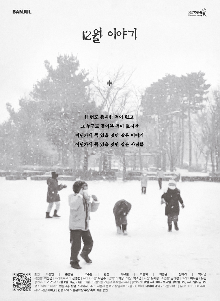 <12월 이야기>는 “어딘가에 꼭 있을 것만 같은 사람들, 존재한 적 없지만 있을 것만 같은 이야기”라는 정서를 바탕으로 서늘하고 투명한 감성을 품고 있다. 카페 ‘12월 이야기’를 중심으로 서로 다른 삶을 살아온 여덟 명의 인물이 연말의 어느 밤 한자리에 모이며, 고백과 침묵, 사랑과 상처, 환상과 회귀가 뒤섞이는 독특한 연극적 세계를 펼쳐낸다. 이 공간은 단순한 무대가 아니라 관객의 기억을 두드리는 ‘유년의 집’, 그리고 마음의 은둔처로 설정돼 있다.