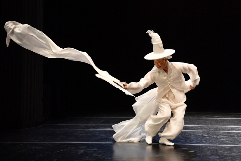 백색 물결이 공간을 뒤덮는다. 계명대학교 김현태 교수의 ‘장유경류 선(扇)살풀이춤’이다. 부채에 긴 명주 수건을 붙여서 추는 이 춤은 장유경 명예교수에 의해 확산되고 있는 지역의 대표 춤이다. 직선과 곡선의 만남, 오브제의 이채로운 춤적 활용 등이 창작성을 높이는 역할을 했다. 김현태는 종반부의 흥겨운 가락이 나올 때 춤에 노닌다. 여운 있게 마무리한다. 춤적 잔향(殘香) 깊다.